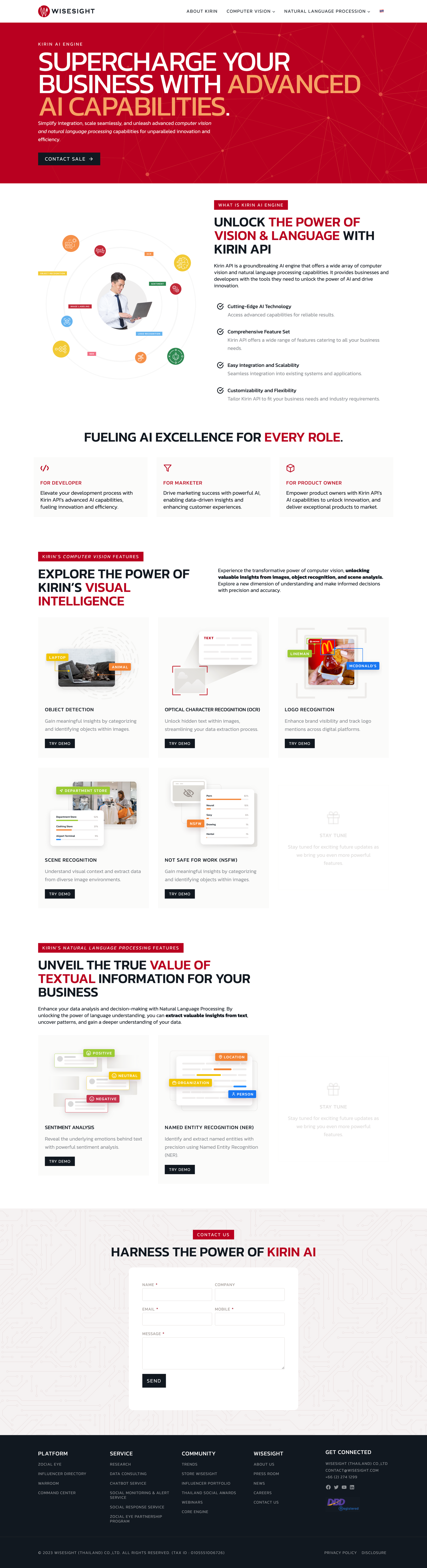 The current website was designed to demonstrate Wisesight’s AI engine for social media data analysis, but it did not originally plan to offer the API itself. Therefore, the redesign aims to update the website to reflect Wisesight’s new goal of providing the Kirin API to clients. This involves reimagining the website to clearly communicate the features of the API, ensuring potential users understand its benefits and how they can utilize it for their own projects.